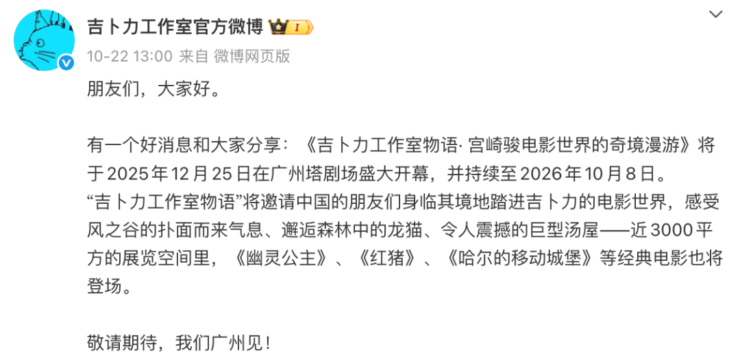 10月22日,@吉卜力工作室官方微博发消息称,《吉卜力工作室物语· 宫崎骏电影世界的奇境漫游》将于2025年12月25日在广州塔剧场盛大开幕,并持续至2026年10月8日。